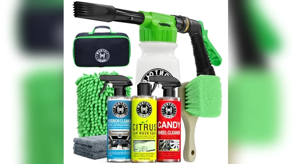 A car wash kit usually includes soap, foam gun, brushes, microfiber towels, wheel cleaner, and interior detailer. Some kits add buckets, sponges, and extension poles for thorough cleaning.