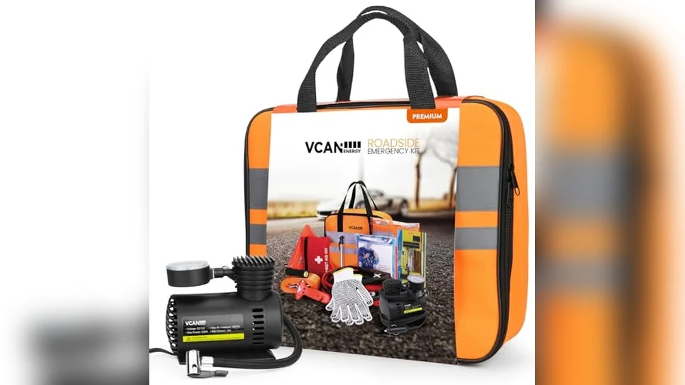 The VCANENERGY kit includes a portable air compressor, jumper cables, a first aid kit, and a tire pressure gauge. It also has emergency tools and a durable carry bag, making it ideal for teens and women.