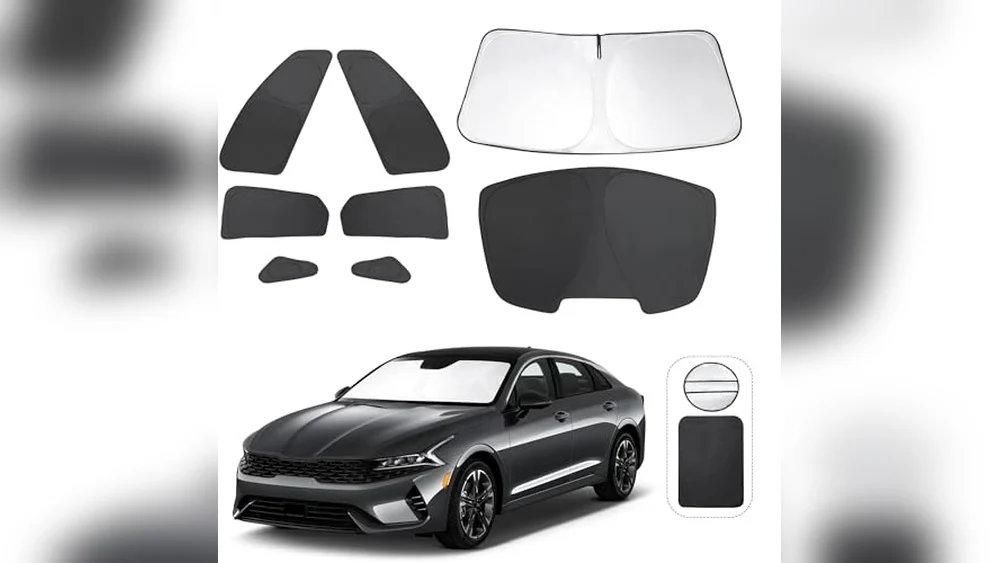The 8PCS Windshield Sun Shade Custom Fit for the 2021-2024 2025 Kia K5, GT-Line, GT, Sedan is ideal for Kia K5 owners who want to protect their vehicle’s interior from harmful UV rays while maintaining privacy and comfort. This full set is perfect for those who frequently park outdoors or live in sunny climates and want to keep their car cool and shielded from the sun’s glare.